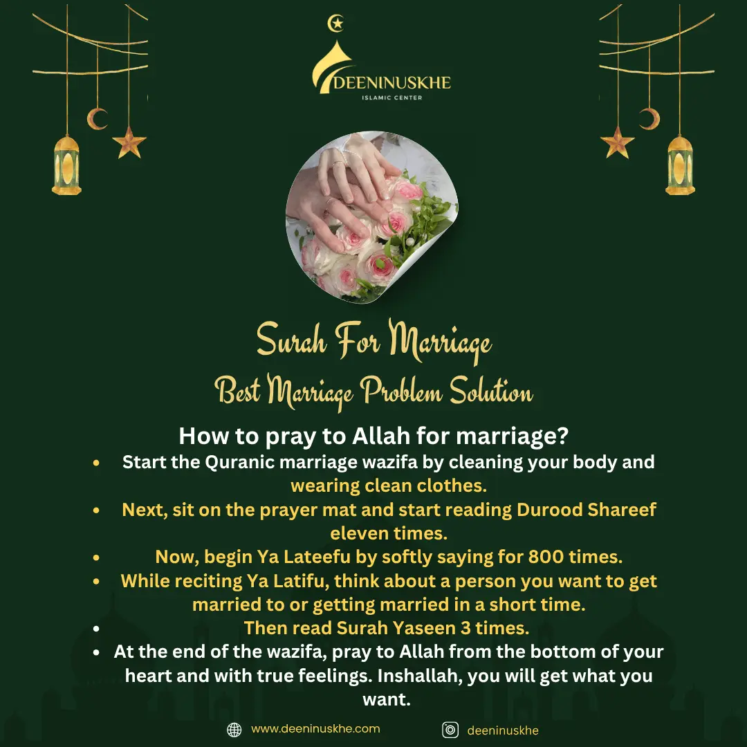 All these Surahs are taken from the Quran, and they will help you on the path of your marriage and also guide you on the path of spirituality. We hope that with the help of this information and the surahs, we will be able to help you in your life. Those people who need help with their problems and are seeking assistance then you must feel free to contact our expert Mosin Khan. Our Islamic community of deeninuskhe will give you the best solutions with guaranteed results.